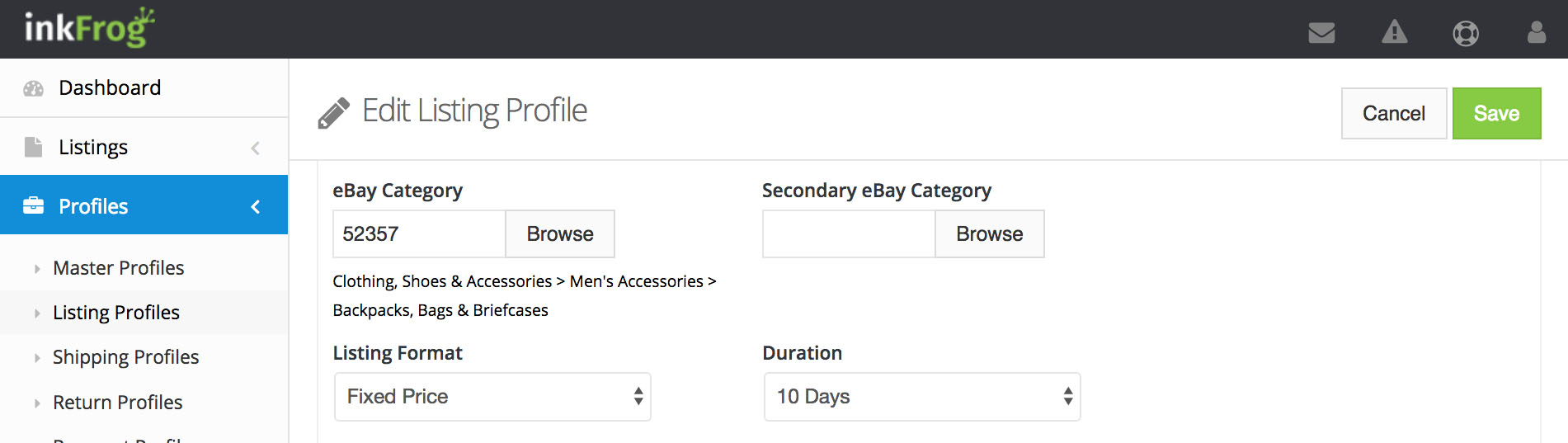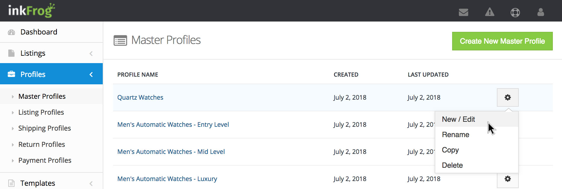 There are five kinds of profiles in inkFrog—listing profiles, shipping profiles, return profiles, payment profiles, and master profiles that tie the others together.