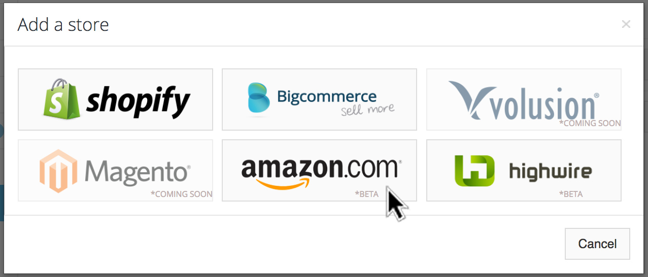 Start by selecting "Store Connector" → "Add a Store" from the inkFrog sidebar. Select the Amazon option to start the process to link your store.