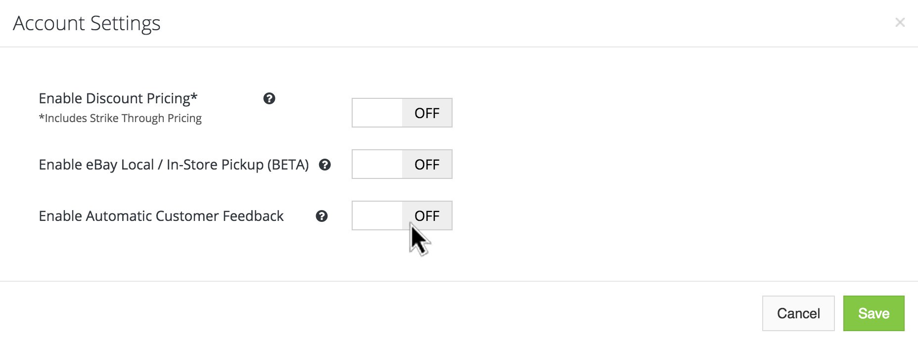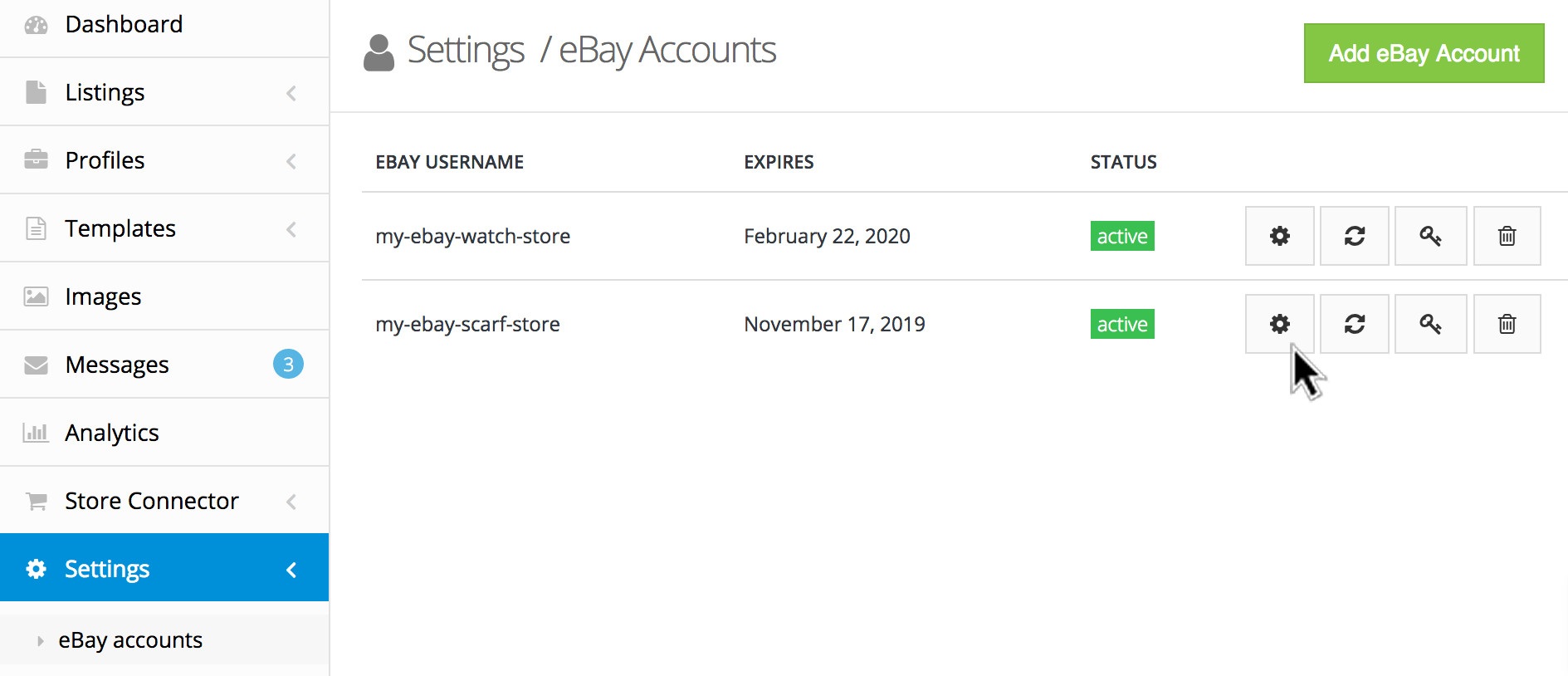 Click "Settings" → "eBay accounts" and then on the settings icon for a linked eBay account.