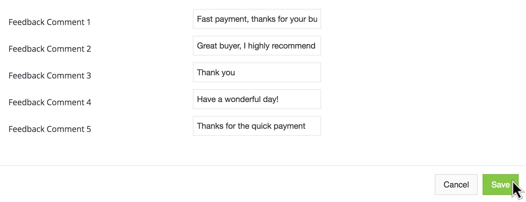 Defaults are provided, but it's best to take a moment to customize these comments for your own business. Doing this prevents the appearance that you're leaving generic feedback automatically, and enables you to take advantage of a branding opportunity.